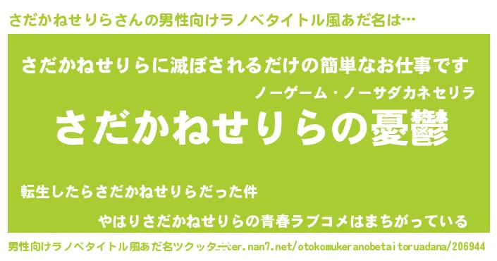 女子向けラノベタイトル風あだ名 | 『(仮)さだかねせりらのやんごとなき事情』 |