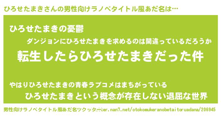 女子向けラノベタイトル風あだ名 | 『婚約破棄系悪役ひろせたまきに転生したので、保身に走りました。』 |