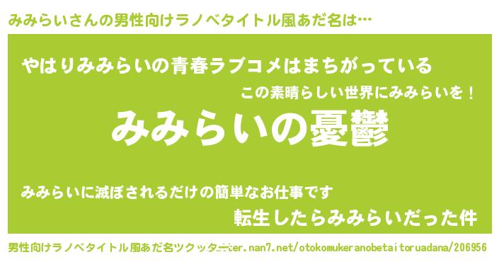 女子向けラノベタイトル風あだ名 | 『(仮)みみらいのやんごとなき事情』 |