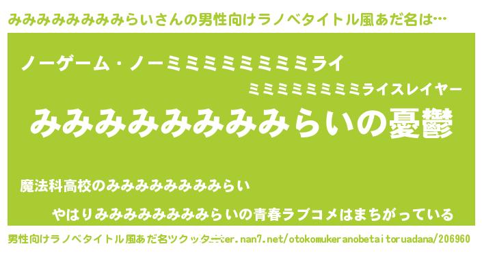 女子向けラノベタイトル風あだ名 | 『(仮)みみみみみみみみらいのやんごとなき事情』 |