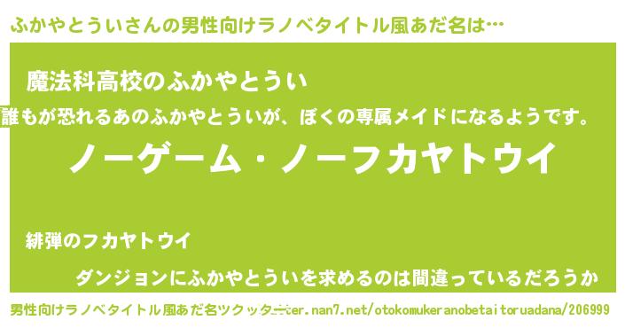 | 女子向けラノベタイトル風あだ名 | 『死神ふかやとういの再婚』 |
