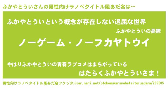 | ヘコむあだ名 | 『ふかやとうい(笑)』『ふかにゅー』 |