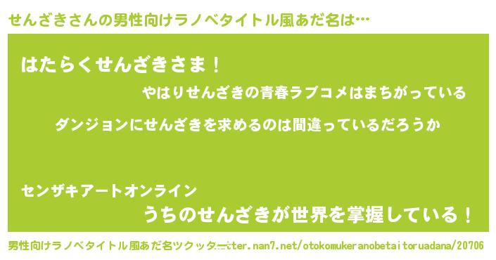 | ヒーロー風カッコイイあだ名 | 『黄金騎士セン』『ウルトラせんざきマン』 |