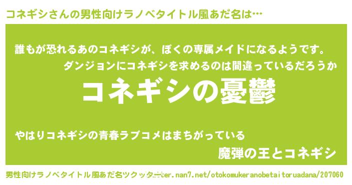 女子向けラノベタイトル風あだ名 | 『(仮)コネギシのやんごとなき事情』 |