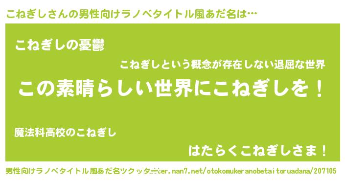 | 胡散臭い通販商品みたいなあだ名 | 『あなたにだけ特別に提供する100年もののヴィンテージワイン…その名も「こねぎし」』 |