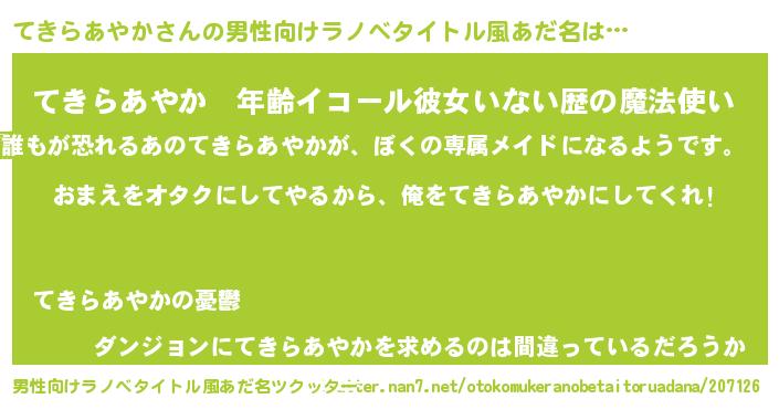 女子向けラノベタイトル風あだ名 | 『てきらあやか夫妻のなれそめ』 |