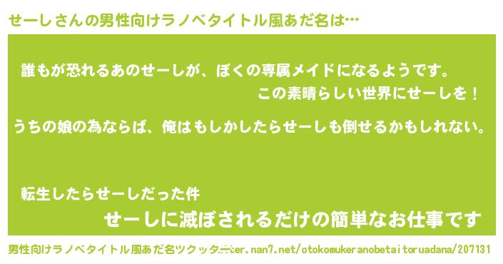 女子向けラノベタイトル風あだ名 | 『せーし伯爵の花嫁』 |