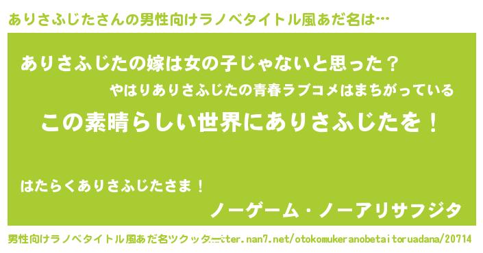 | 胡散臭い通販商品みたいなあだ名 | 『あなたにだけ特別に提供する限定10本のレアな日本酒…その名も「ありさふじた」』 |