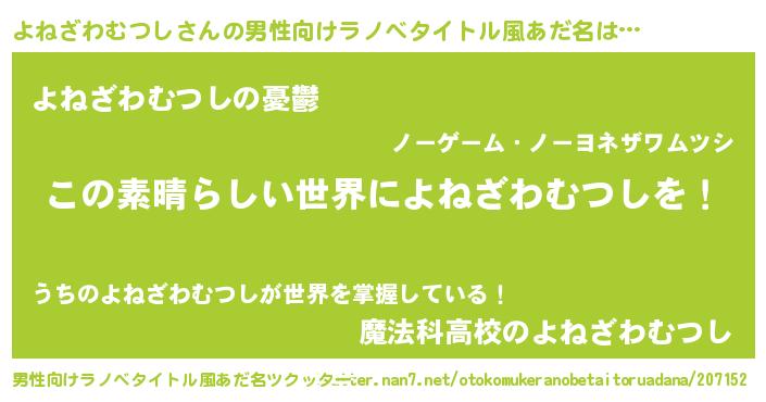 女子向けラノベタイトル風あだ名 | 『乙女ゲームの破滅フラグしかない悪役よねざわむつしに転生してしまった…』 |