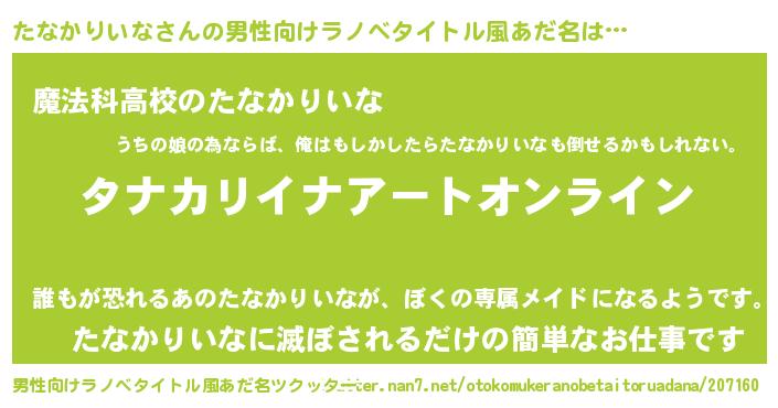 女子向けラノベタイトル風あだ名 | 『誰かこのたなかりいなを説明してください! ~契約から始まるウェディング~』 |