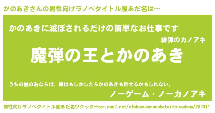 女子向けラノベタイトル風あだ名 | 『かのあきが死なない童話 林檎のかのあきの診療簿』 |