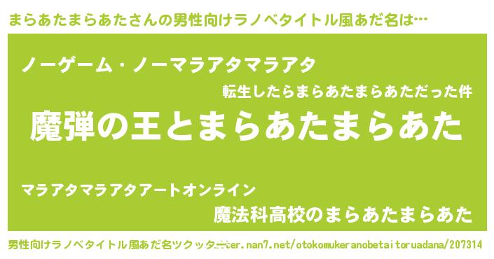 | 女子向けラノベタイトル風あだ名 | 『まらあたまらあたが死なない童話 林檎のまらあたまらあたの診療簿』 |