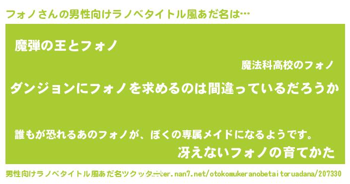 女子向けラノベタイトル風あだ名 | 『フォノの卵を拾いまして』 |