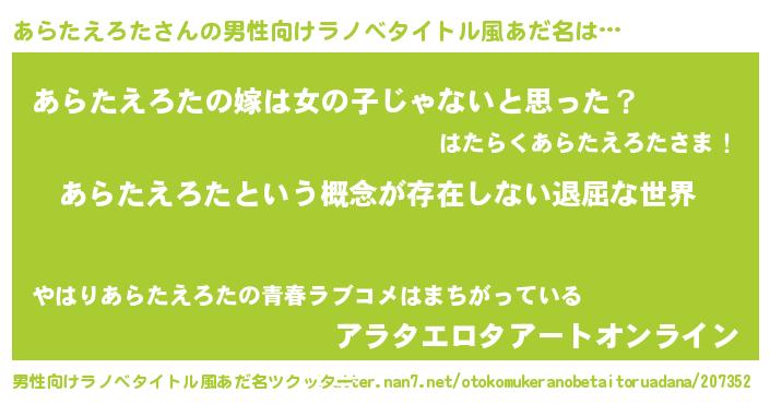 | 女子向けラノベタイトル風あだ名 | 『異世界で失敗しない100のあらたえろた』 |