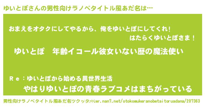 | 伝説のあだ名 | 『救世主となる技術者ゆいとぽ』 |