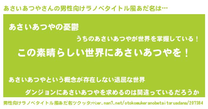 女子向けラノベタイトル風あだ名 | 『悪役あさいあつやに転生したようですが、知った事ではありません』 |