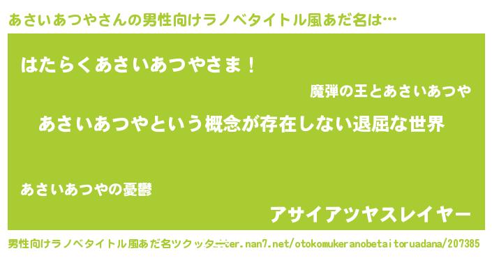 女子向けラノベタイトル風あだ名 | 『異世界で失敗しない100のあさいあつや』 |