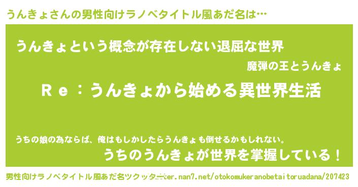 | 女子向けラノベタイトル風あだ名 | 『闇のうんきょ』『うんきょの契約王妃』 |