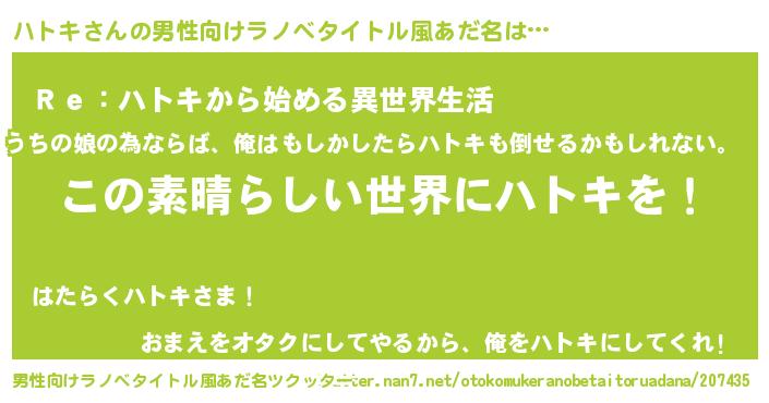 | 意味不明あだ名 | 『住所不定無職ハトキ(85歳)』『自称ハトキ』 |