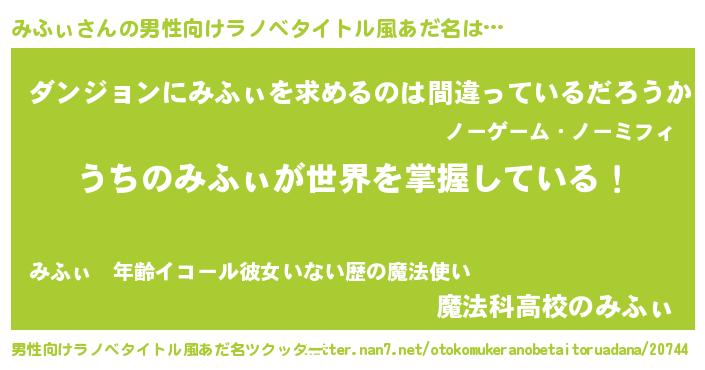 | 女子向けラノベタイトル風あだ名 | 『男装みふぃの憂鬱な任務』 |