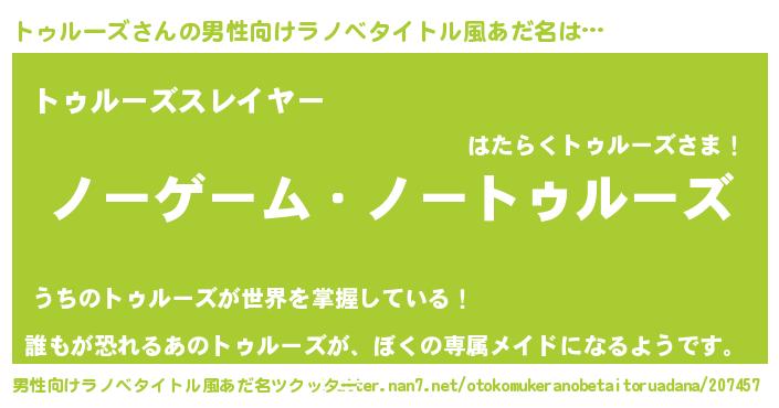 | 女子向けラノベタイトル風あだ名 | 『死神トゥルーズの再婚』 |