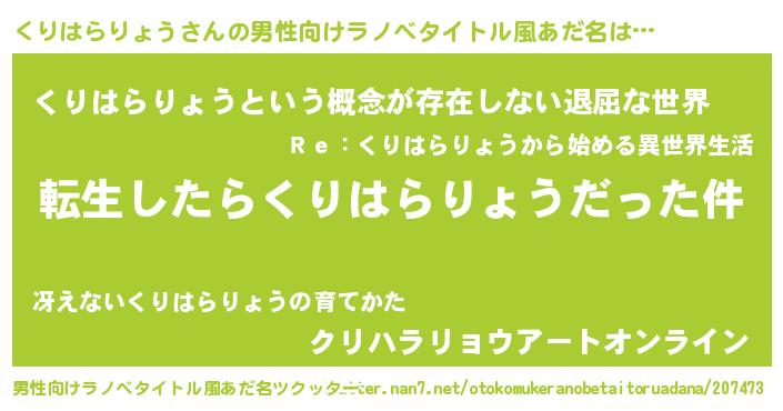 | 女子向けラノベタイトル風あだ名 | 『くりはらりょうの玉の輿計画!』 |
