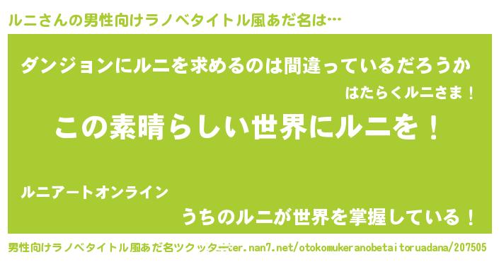 | 女子向けラノベタイトル風あだ名 | 『乙女ゲームの破滅フラグしかない悪役ルニに転生してしまった…』 |