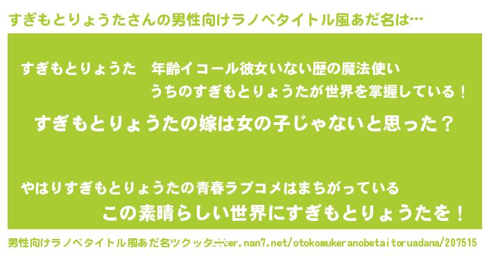 | 女子向けラノベタイトル風あだ名 | 『すぎもとりょうたの卵を拾いまして』 |