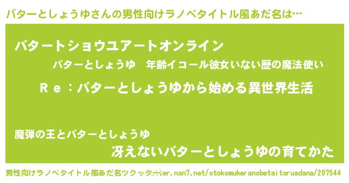 | 女子向けラノベタイトル風あだ名 | 『闇のバターとしょうゆ』 |