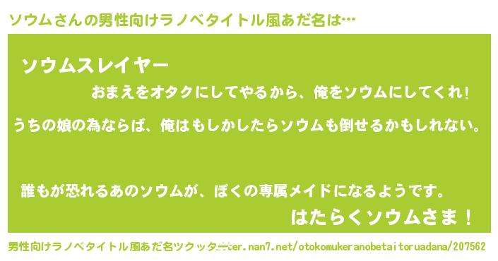 | 女子向けラノベタイトル風あだ名 | 『ソウムの婚約者』『ソウム恋絵巻』 |