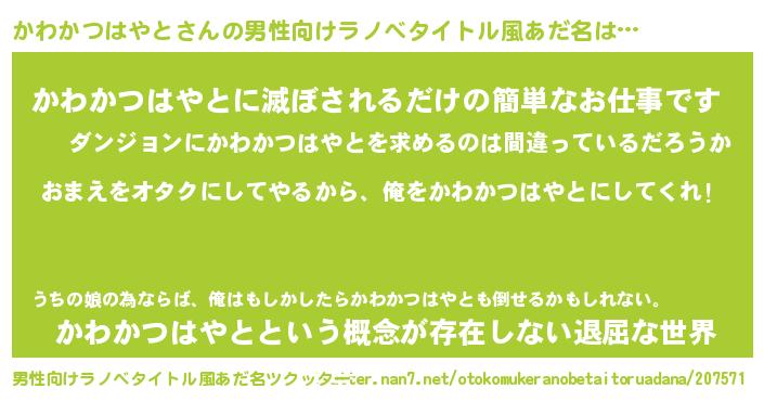 | 女子向けラノベタイトル風あだ名 | 『かわかつはやと夫妻のなれそめ』 |