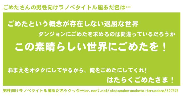 | 女子向けラノベタイトル風あだ名 | 『乙女ゲームの破滅フラグしかない悪役ごめたに転生してしまった…』 |