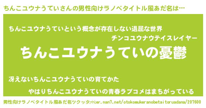 | 女子向けラノベタイトル風あだ名 | 『(仮)ちんこユウナうていのやんごとなき事情』 |
