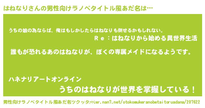| ヘコむあだ名 | 『はねなり(小並感)』『酢こんぶ』 |