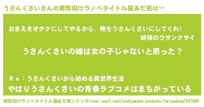 | 女子向けラノベタイトル風あだ名 | 『うさんくさいの卵を拾いまして』 |