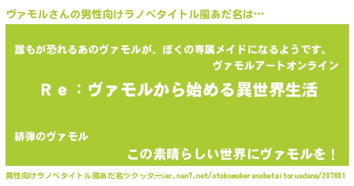 | 女子向けラノベタイトル風あだ名 | 『闇のヴァモル』『ヴァモルの契約王妃』 |