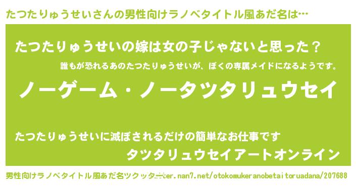 | 女子向けラノベタイトル風あだ名 | 『たつたりゅうせい恋絵巻』 |