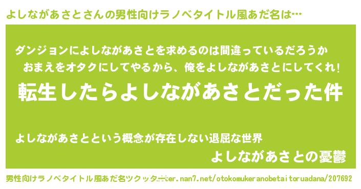 | 伝説のあだ名 | 『解き放たれた僧侶よしながあさと』 |