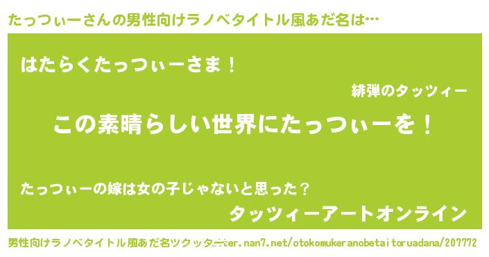 | 女子向けラノベタイトル風あだ名 | 『悪役たっつぃーに転生したようですが、知った事ではありません』 |
