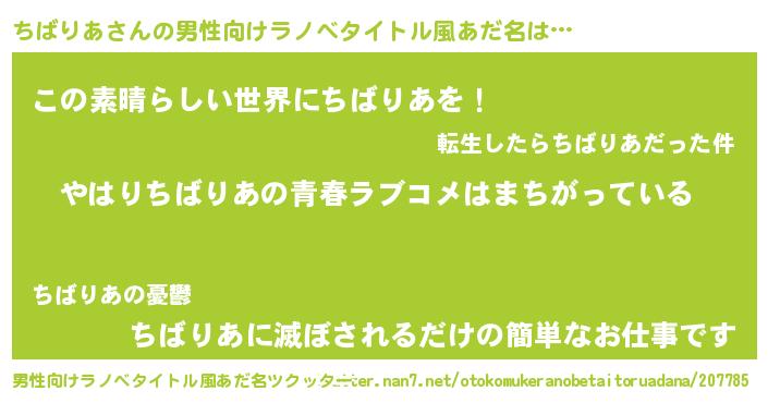 | 女子向けラノベタイトル風あだ名 | 『ちばりあ伯爵の花嫁』 |