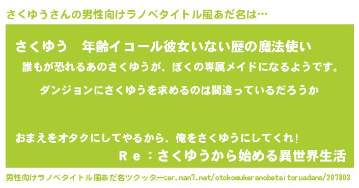 | 女子向けラノベタイトル風あだ名 | 『さくゆうの卵を拾いまして』 |