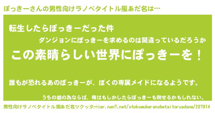 | 女子向けラノベタイトル風あだ名 | 『悪役ぽっきーに転生したようですが、知った事ではありません』 |