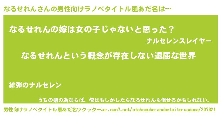 | 女子向けラノベタイトル風あだ名 | 『異世界で失敗しない100のなるせれん』 |