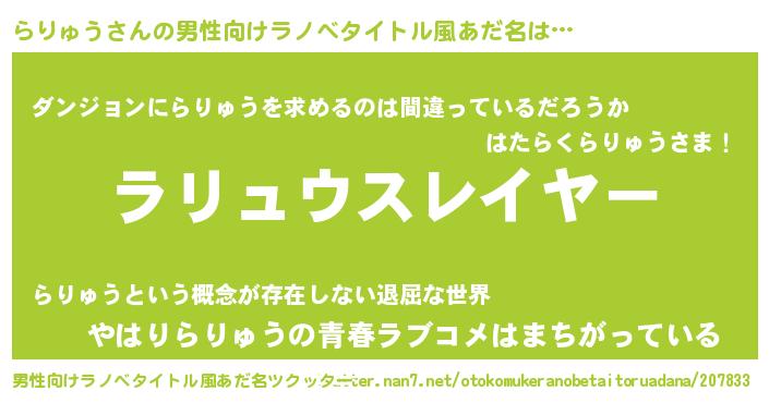 | 胡散臭い通販商品みたいなあだ名 | 『信頼と実績のペンダント…その名も「らりゅう」』 |
