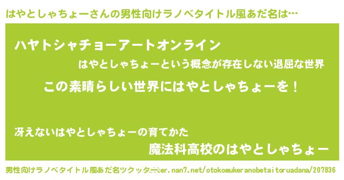 | 胡散臭い通販商品みたいなあだ名 | 『あなたにだけ特別に提供する世界で10本だけ現存している希少なブランデー…その名も「はやとしゃちょー」』 |