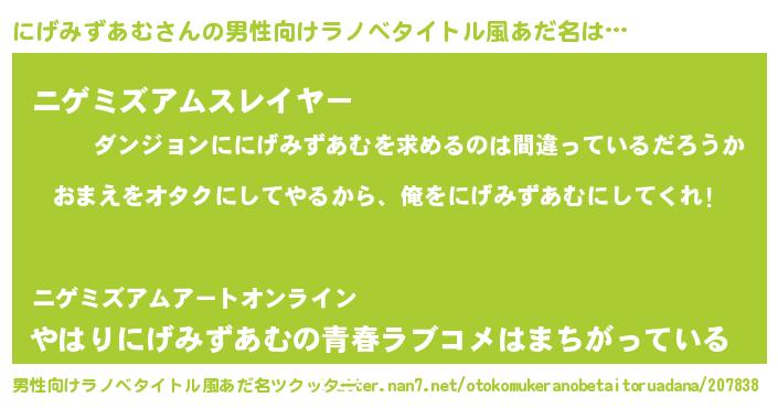| 女子向けラノベタイトル風あだ名 | 『にげみずあむ恋絵巻』 |