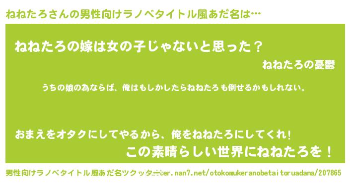 | 女子向けラノベタイトル風あだ名 | 『ねねたろ伯爵の花嫁』『ねねたろ恋絵巻』 |