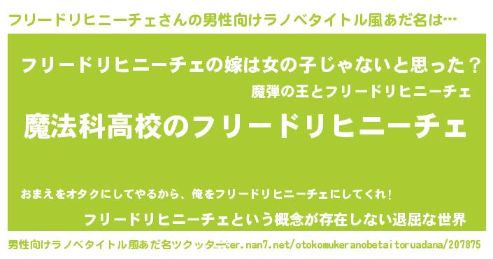 | 女子向けラノベタイトル風あだ名 | 『フリードリヒニーチェなんてお断りですっ。』 |