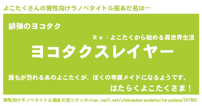 | 意味不明あだ名 | 『めかぶ科よこたく属』『自称よこたく』 |