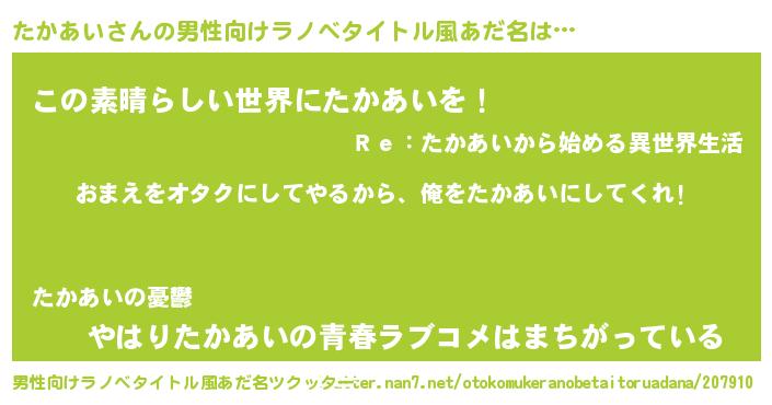 | 女子向けラノベタイトル風あだ名 | 『たかあい夫妻のなれそめ』 |